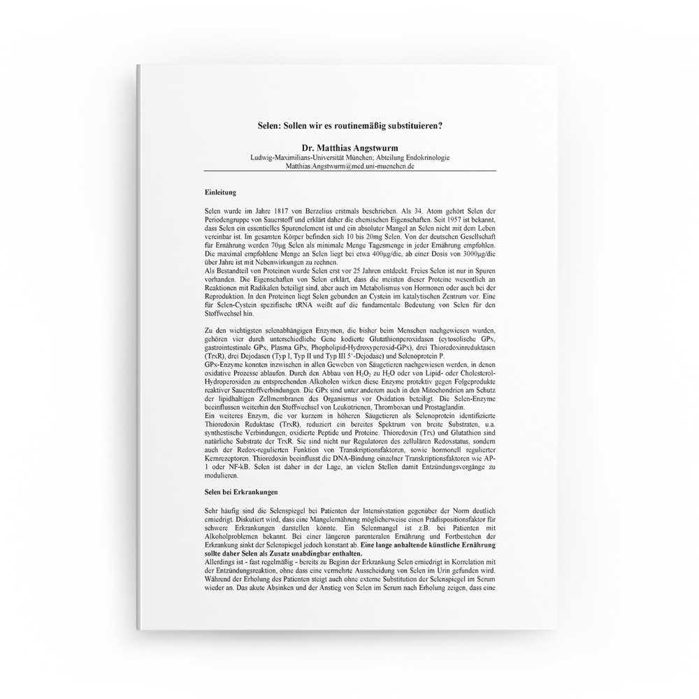 Selen wurde im Jahre 1817 von Berzelius erstmals beschrieben. Als 34. Atom gehört Selen der Periodengruppe von Sauerstoff und erklärt daher die chemischen Eigenschaften. Seit 1957 ist bekannt, dass Selen ein essentielles Spurenelement ist und ein absoluter Mangel an Selen nicht mit dem Leben vereinbar ist. Im gesamten Körper befinden sich 10 bis 20mg Selen. Von der deutschen Gesellschaft für Ernährung werden 70μg Selen als minimale Menge Tagesmenge in jeder Ernährung empfohlen.